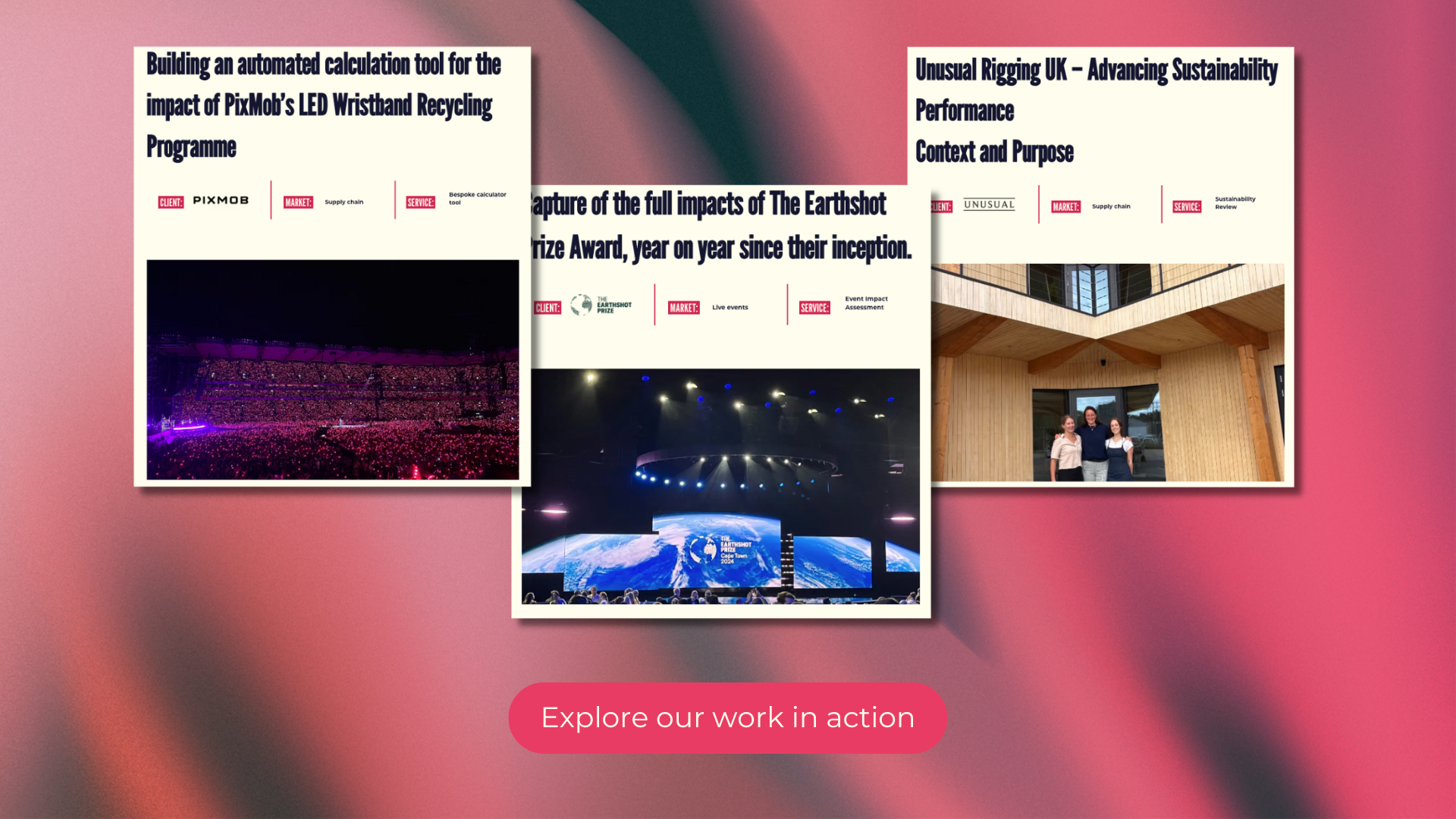 With Unusual Rigging UK, we carried out a comprehensive sustainability review and carbon reduction roadmap, helping the company benchmark against peers, strengthen governance, and enhance accountability. For PixMob, creators of the light-up wristbands seen at events like Coldplay’s world tour, we built a bespoke calculation tool that enables them to measure and communicate the real impact of their Recycling Programme, showcasing tangible outcomes to clients and partners. And with IBC, one of the largest international broadcasting conventions, we developed a Sustainability & ESG Strategy that established clear goals, measurable carbon reduction targets, and a framework for educating and influencing the wider industry.
